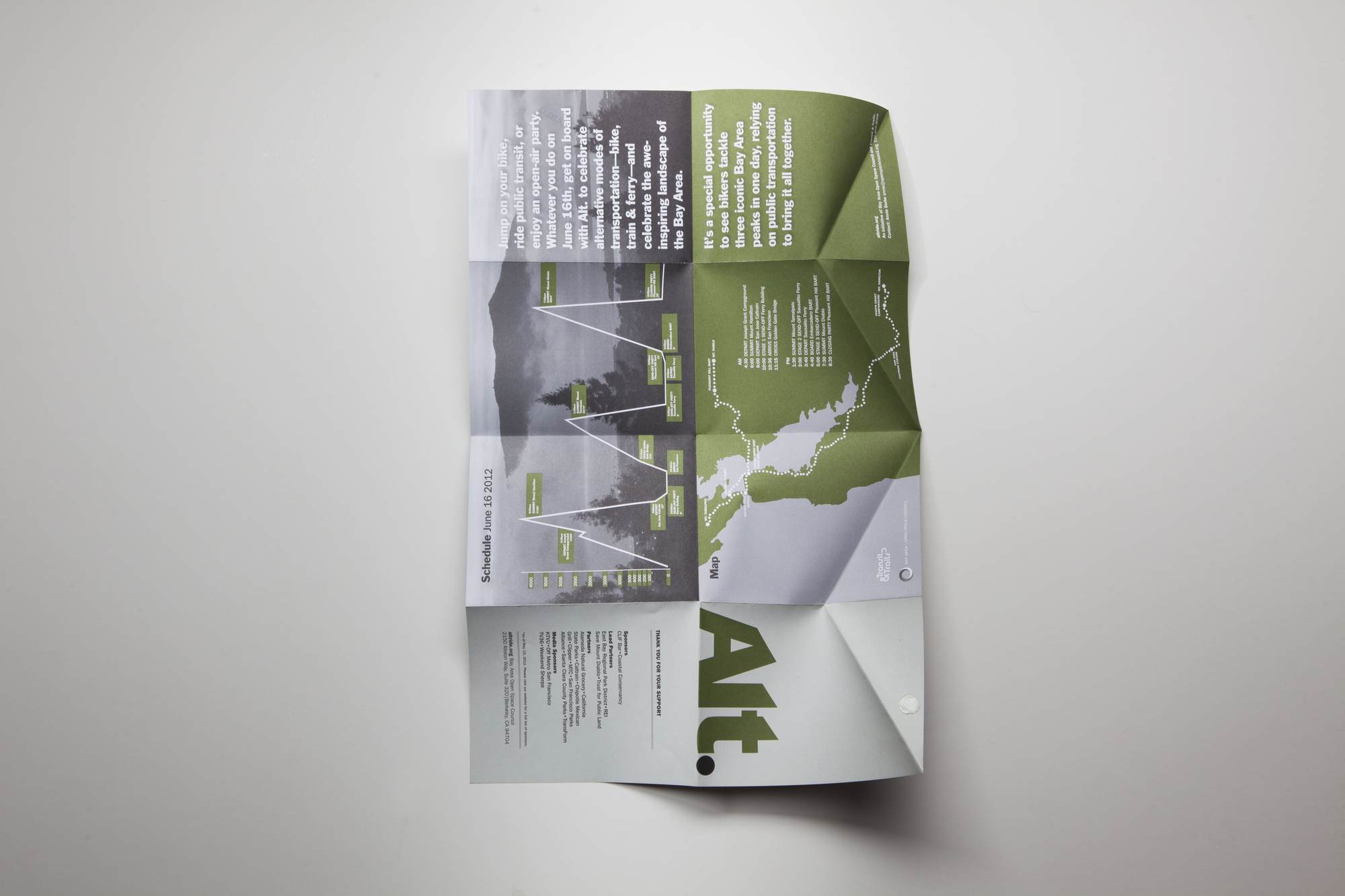 Alt. is a reference both to “alternative” modes of transportation as well as “altitude”. An energetic diagonal creates the three peaks in the logotype, and the color palette was inspired by the colors found in the natural environment of the Bay Area.