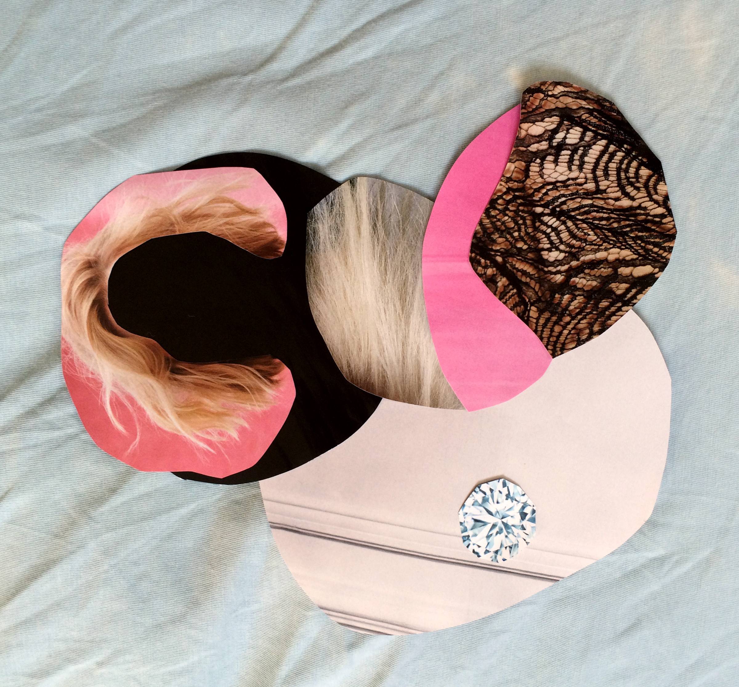 A series of simple composition exercises created on bed pillows and other soft surfaces. Material sourced from Vogue Magazine, June 2016.